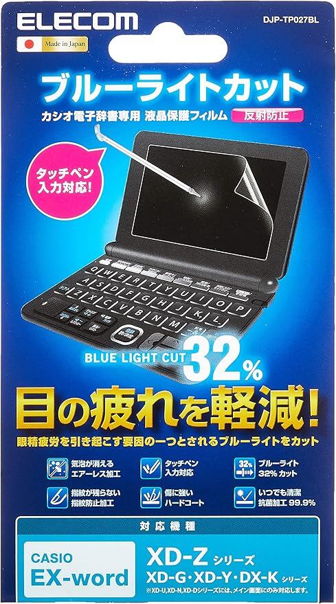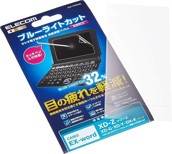 <B>製品概要:</B>カシオ[2015年新モデル]に対応。電子辞書の液晶画面をキズや汚れから守る、ブルーライトカットタイプの液晶保護フィルム。 可視光線の中で強いエネルギーを持つ青色光を約32%カット。