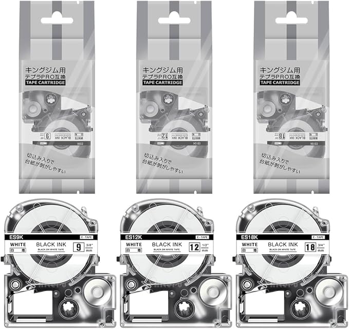 【テープセット】: テプラ テープ SS9K SS12K SS18K の互換品、3個セット。【汎用サイズ】: 9mm + 12mm + 18mm * 8m 。【色】: 白地黒文字。