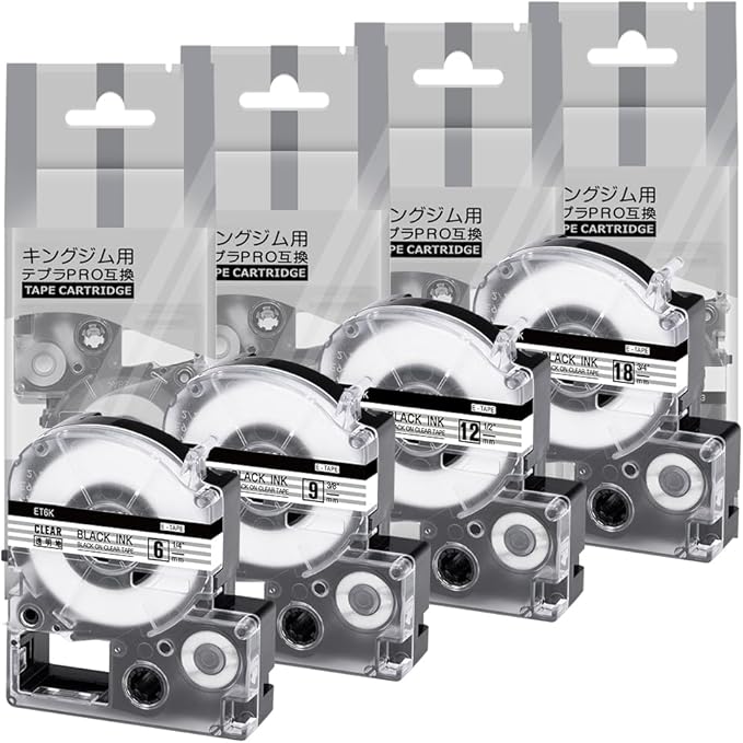 互換テプラ テープ 6mm 9mm 12mm 18mm 透明地黒文字 キングジムテプラPROカートリッジと互換性のある ST6K ST9K ST12K ST18K Kingjim Tepra SR530 SR670 SR720 SR750 SR950用 4個セット Wonfoucs | oioioichan
