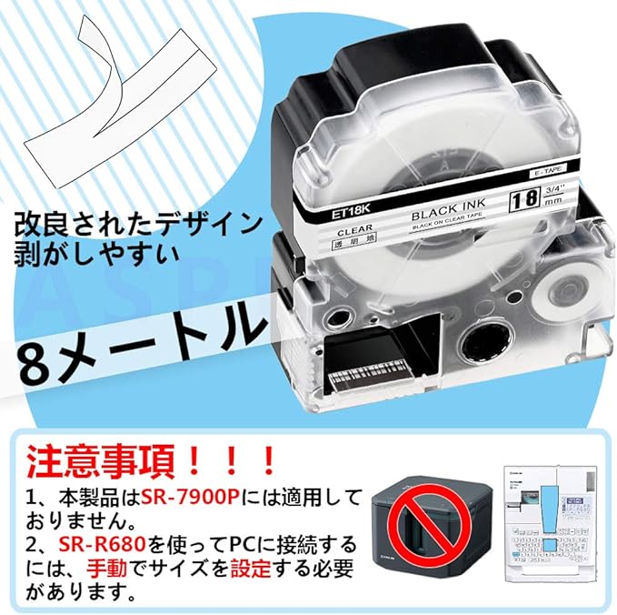 [ サイズ ]: 幅--18mm 長さ--8m。ASprinte互換テプラ テープ 透明 18mmは防水性、腐食防止性、強粘性