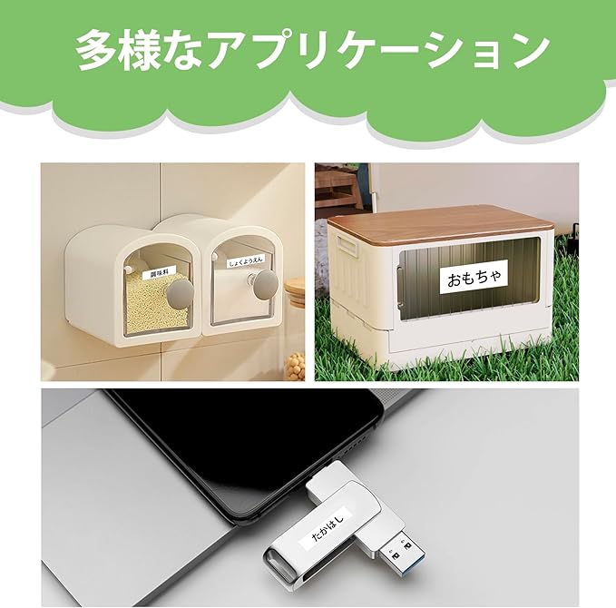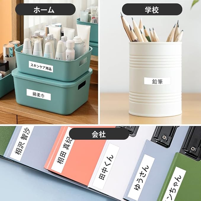 【適用場合】: オフィスで文書と事務用品の管理、倉庫のインベントリの整理、家庭用品の整理、お持ち物の名前シールを作る場合など広く使われています。