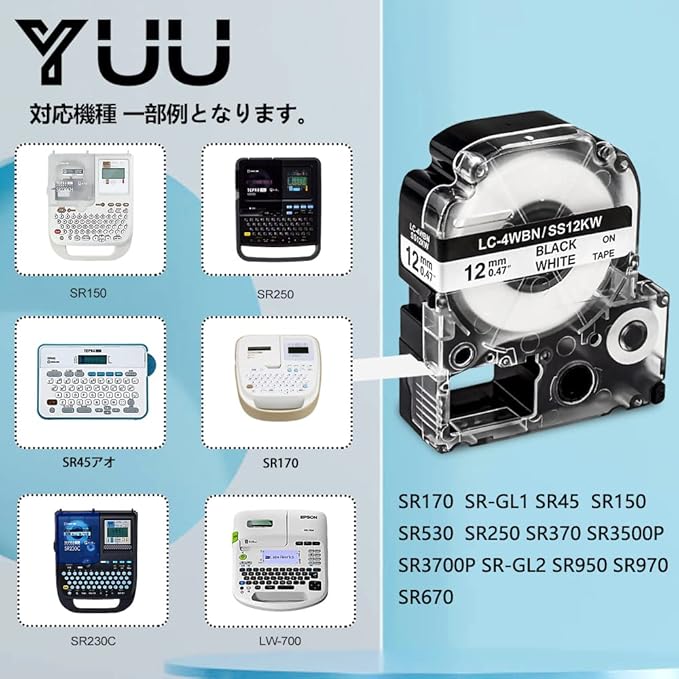 【幅広い対応機種】このテプラ 9mm 白 12mm 6mm 白は以下の機種に対応しています。SR150、SR170、SR250、SR370、SR-GL1、SR-GL2、SR950、SR970、SR670、SR750、SR550、SR530、SR3500P、SR3700P、SR3900P、SR30、SR50、SR51、SR52、SR55、SR40、SR45、SR210、SR220、SR130、SR606、SR707、SR515、SR717、SR616、SR-MK1ヘー、SR-MK1及びその他キングジム ラベルライター機種。