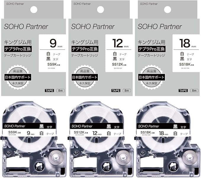 3個セット キングジム テプラ 互換カートリッジ 色: 白テープ黒文字 幅 9mm/12mm/18mm 長さ:8m 型番:SH-KS9K (SS9K互換) SH-KS12K (SS12K互換) SH-KS18K (SS18K互換)
