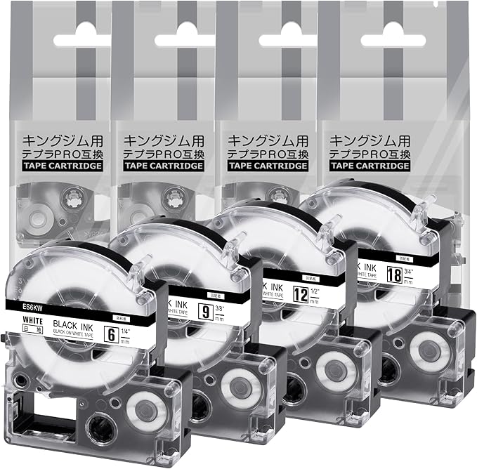 【テープセット】互換キングジム テプラSS6KW SS9KW SS12KW SS18KW。【色】: 白テープに黒文字 。【幅】:6mm 9mm 12mm 18mm組み合わせ4本セット 。【各長さ】:8m
