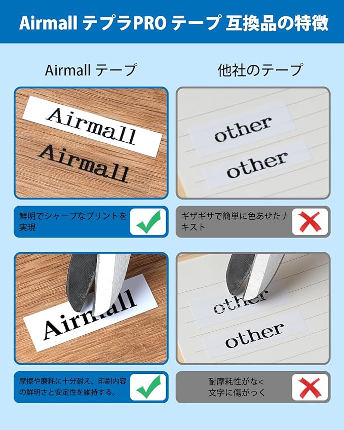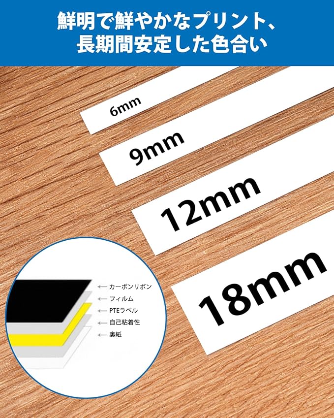互換性テプラ は、プロ仕様の強力な接着剤を備えています。 紙、皮革、木材、ガラス、プラスチック、タイル、セメント、ステンレス鋼など、さまざまな乾燥した平らな表面に取り付けることができます。