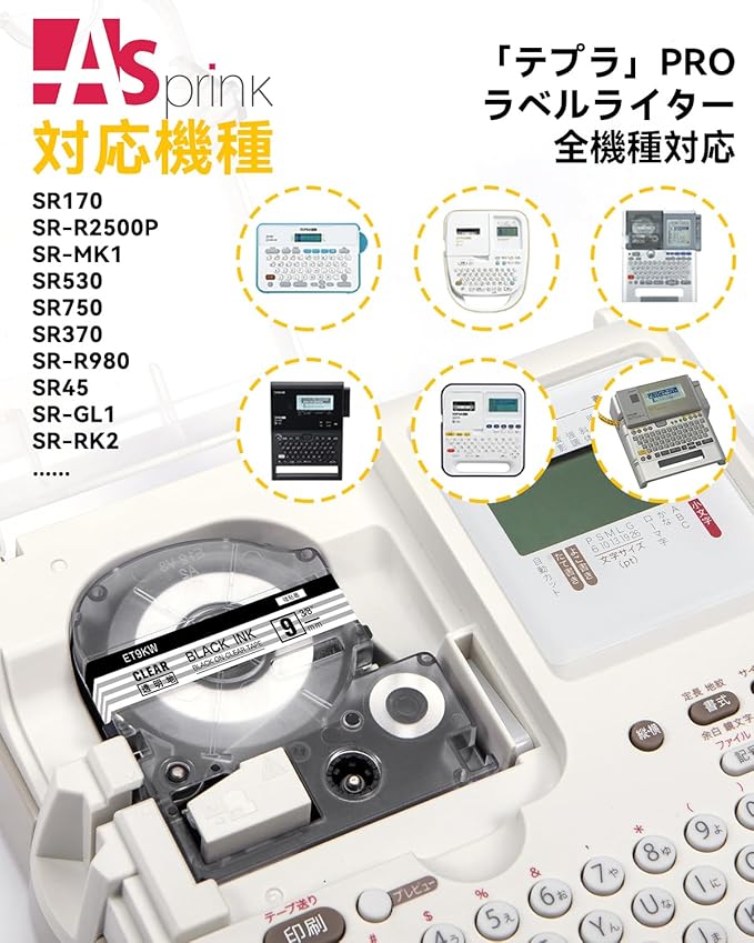 [ ラベルライターに使用 ]: SR-MK1ヘー、SR-MK1カー、SR-R680、SR370、SR170、SR150、SR-GL1、SR-GL2、SR530、SR750、SR970、SR250、SR330、SR3500P、SR670、SR550、SR55、SR45、SR-RK2、SR300TF、SR-RK1、SR5500P、SR6700D、SR3700P、SR5900P、SR950、SR3900P及びその他機種。