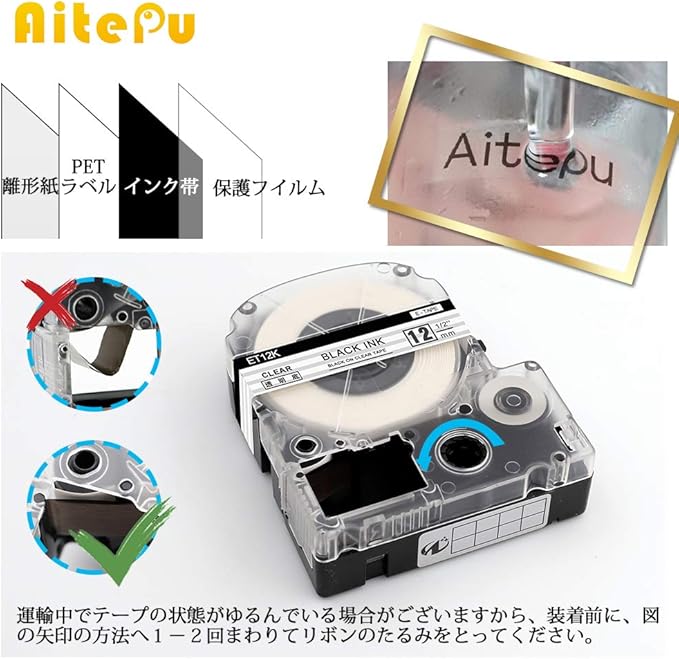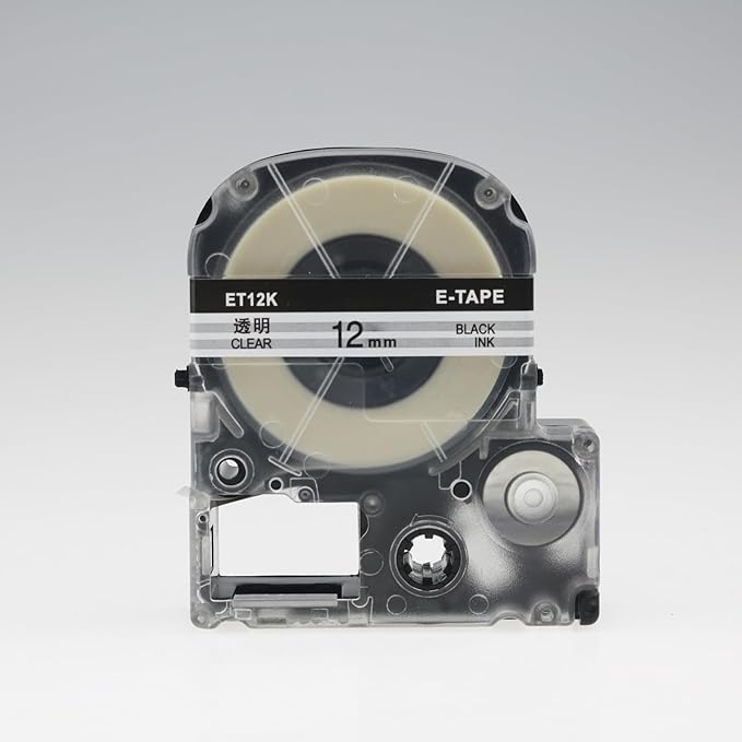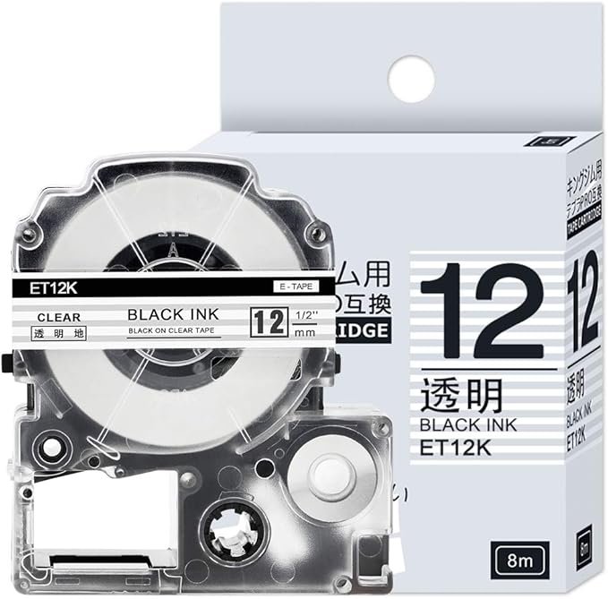 【テープセット】: テプラ テープ 透明 ST12K の互換品、1個セット。【汎用サイズ】: 12mm * 8m 。【色】: 透明地黒文字。