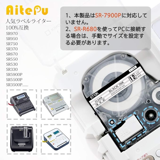 【ラベルライター対応機種】: SR-MK1ヘー、SR-MK1カー、SR-R680、SR370、SR170、SR150、SR-GL1、SR-GL2、SR970、SR950、SR750、SR670、SR550、SR330、SR5900P、SR5500P、SR3900P、SR3500P、SR250、SR45、SR-RK2、SR720、SR600、SR530、SR6700D、SR3700P、SR52、SR300、SR300RK、SR300TF、SR40、SR-RK1、SR818、SR828、SR900、SR910、SR920、SR930、SR606、SR707、SR515、SR717、SR616、SR626、SR636、SR737、SR535、SR710、SR510、SR610X、SR520、SR404、SR313、SR323、SR333、SR50、SR51、SR30、SR210、SR220、SR130、SR-PDP1、SR-PBW及びその他テプララベルライター機種。