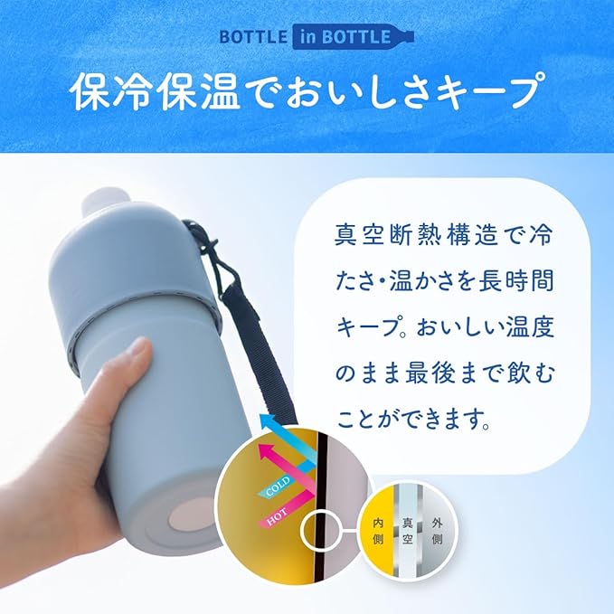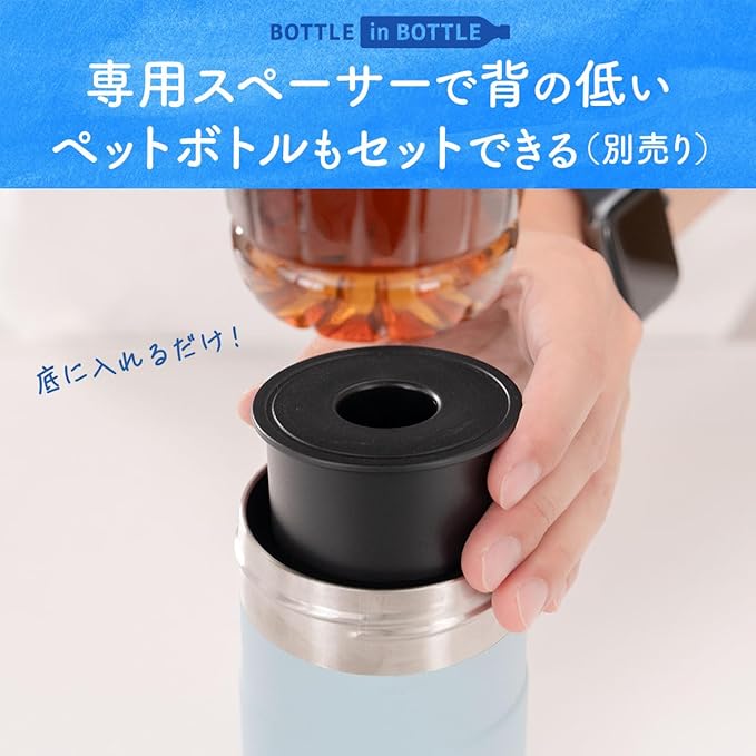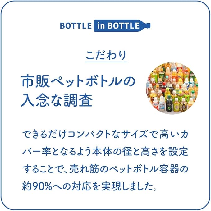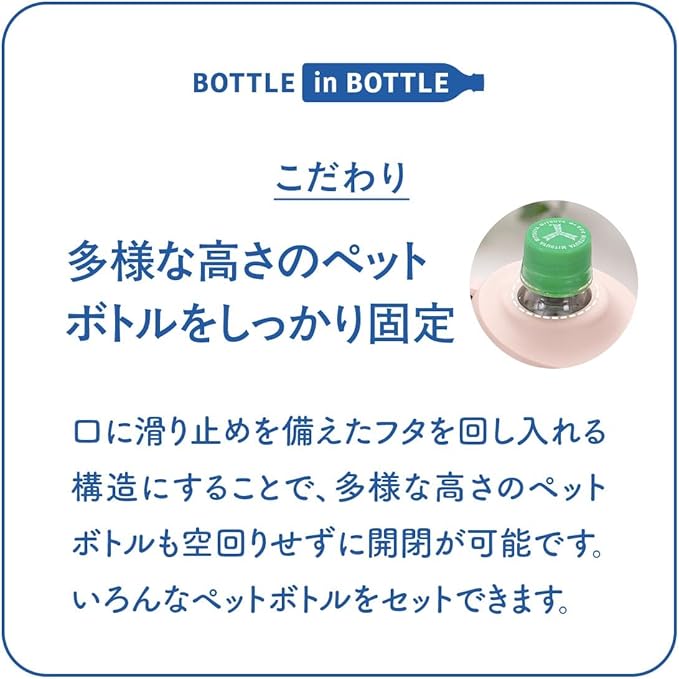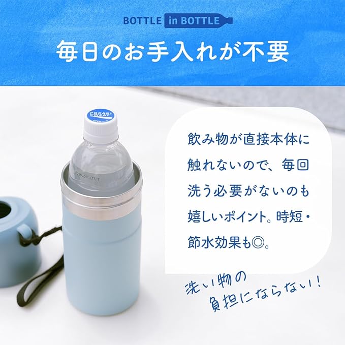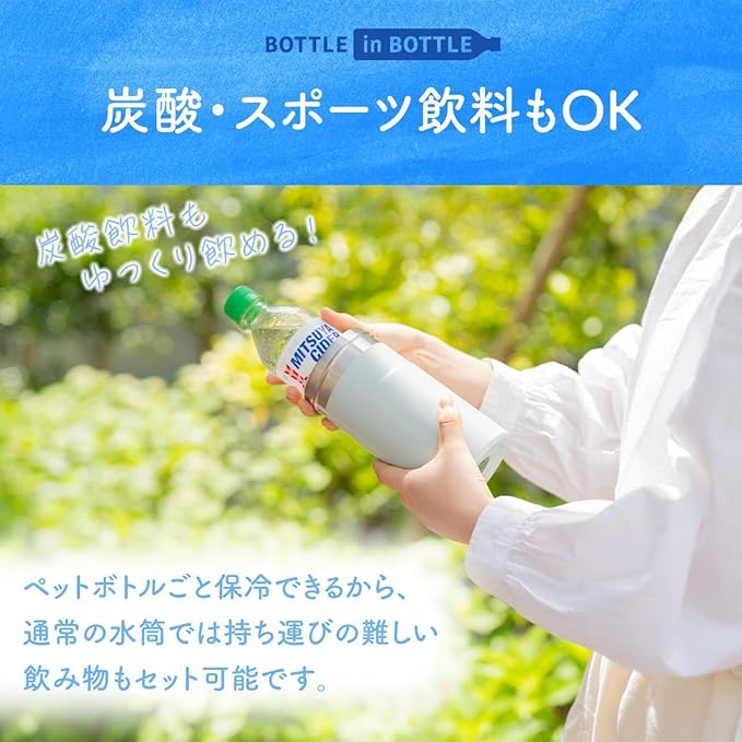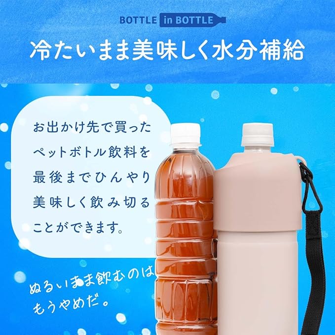 冷やしたペットボトルをそのまま入れるだけ 冷たさ長時間キープ 真空断熱構造で保温保冷効果が長持ち。 市場で売れ筋の90%のペットボトルに対応。 ストラップ付きで持ち運びに便利。 エラストマー付きでキャップを回す際にペットボトルをしっかり固定。 結露しにくくカバンに入れても濡れる心配がない。 水筒では難しい炭酸飲料も保冷可能。