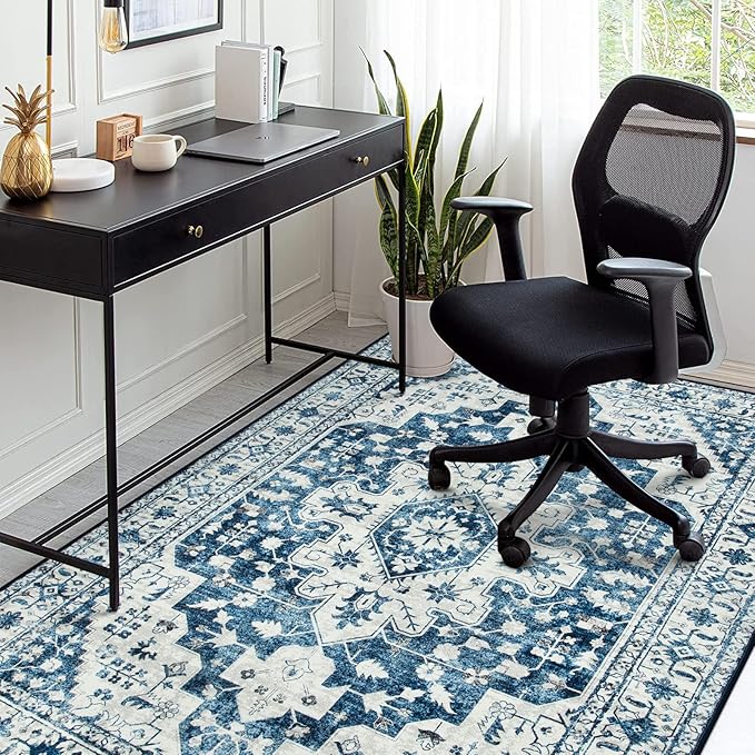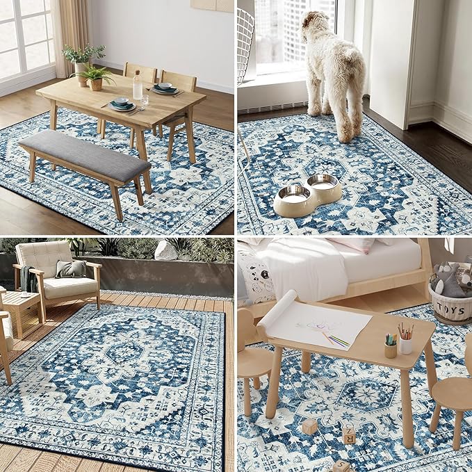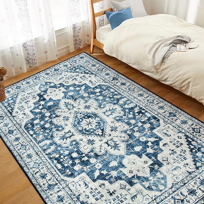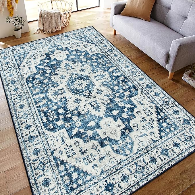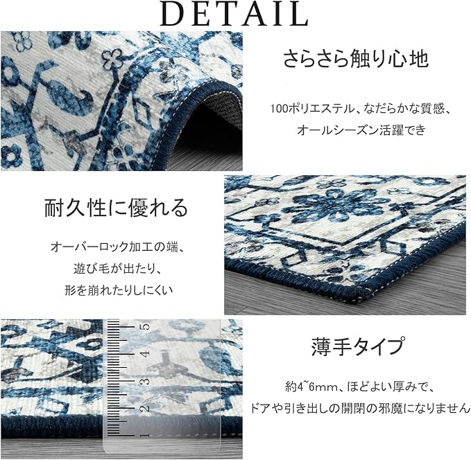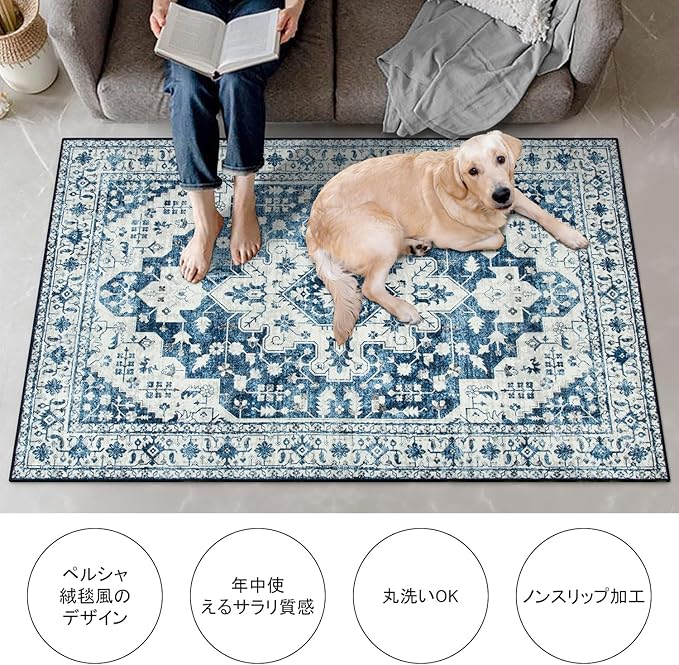 HAOCOO カーペット 洗える 140х200cm ラグ オールシーズン適用 ペルシャ風 じゅうたん 約2畳 滑り止め 防音 寝室 リビング ラグマット 抗菌防臭 耐磨耗性 薄手 ホットカーペット対応 メダリオン柄 ブルー | oioioichan