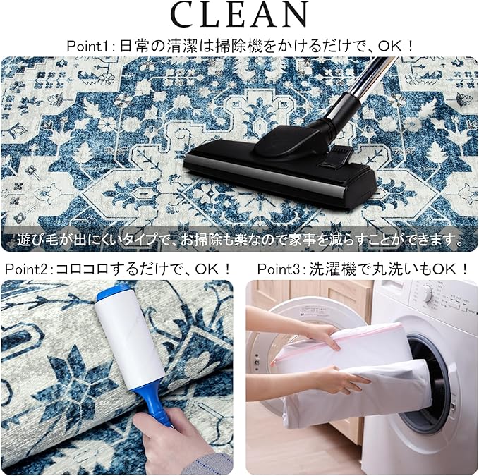 【お手入れ簡単・洗濯機対応】毛足がないため、ホコリやゴミが絡みにくく、日常のお手入れはコロコロや掃除機で簡単に完了。泥汚れがついた場合は、手洗いまたは洗濯ネットに入れて洗濯機で洗えます。※風通しの良い場所で陰干ししてください。アイロン・乾燥機の使用は避けてください