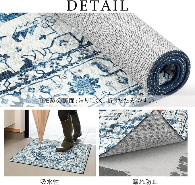 【特徴】TPE製の裏面は、通常の不織布製裏面よりも強力な滑り止め効果を発揮します。高齢者やお子様、ペットのいるご家庭でも安心してご使用いただけます。吸水・防音・防ダニ・抗菌・防臭仕様で、快適な使い心地を提供します。折りたたみや持ち運びが容易です。また、ペットに優しい素材と仕様となっており、ペットの爪や毛などにも耐えるように設計されています