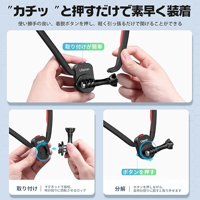 【ネックレス式/物体に巻き付ける 1台で2役】 ボタン式ロックで便利、ワンタッチ開閉でき、しっかり固定され、マウントが落ちる心配ない。ネックレス式で直接装着できるため、撮影時に両手がフリー。また、新デザインは、アルミ合金層を採用しており、柔軟性に優れ、折れずに複数の角度でねじることができます。角度調整可能。料理やお絵かきなどの卓上撮影に活用できます。1台で2役。