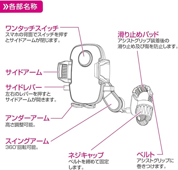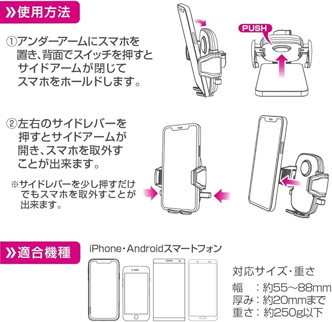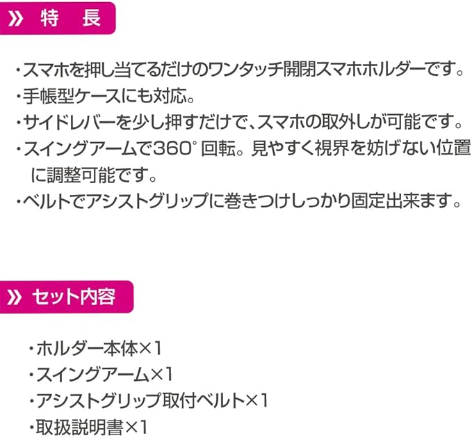 【対応スマホサイズ】幅:約55~88mm/厚み:約20mmまで/ホルダー部耐荷重:約250g以下【セット内容】ホルダー本体 1/スイングアーム 1/アシストグリップ取付ベルト 1/取扱説明書