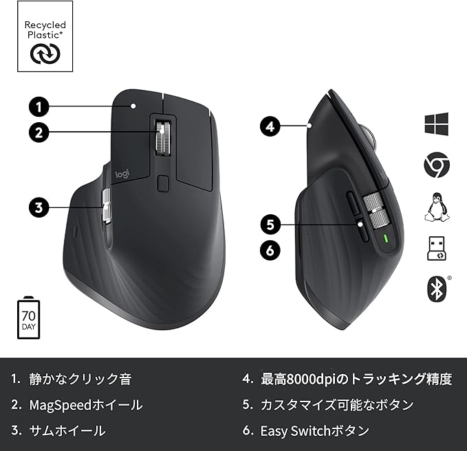 ロジクール MX MASTER3s アドバンスド ワイヤレス マウス 静音 MX2300GR Logi Bolt Bluetooth Unifying非対応 8000dpi 高速スクロールホイール USB-C 充電式 無線 MX2300 グラファイト 国内正規品 | oioioichan