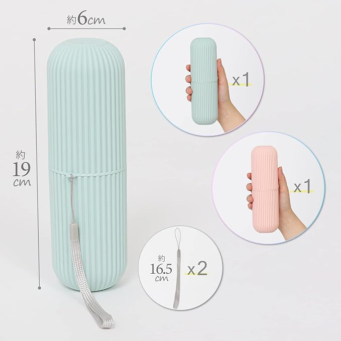 【商品仕様】:サイズ/ケース:約直径6 高さ19cm・ストラップ:全長約16.5cm、内容/ケース2個(薄ピンク色 1・水色 1)・ストラップ2本、カラー/ケース:薄ピンク色・水色・ストラップ/グレー、材質/ポリプロピレン