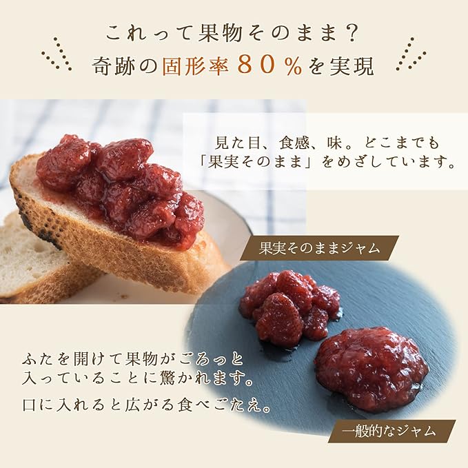 奇跡の固形率80%を実現。見た目、食感、味。どこまでも「果実そのまま」をめざしています。まずはふたを開けて果物がごろっと入っていることに驚かれる方が多くいらっしゃいます。