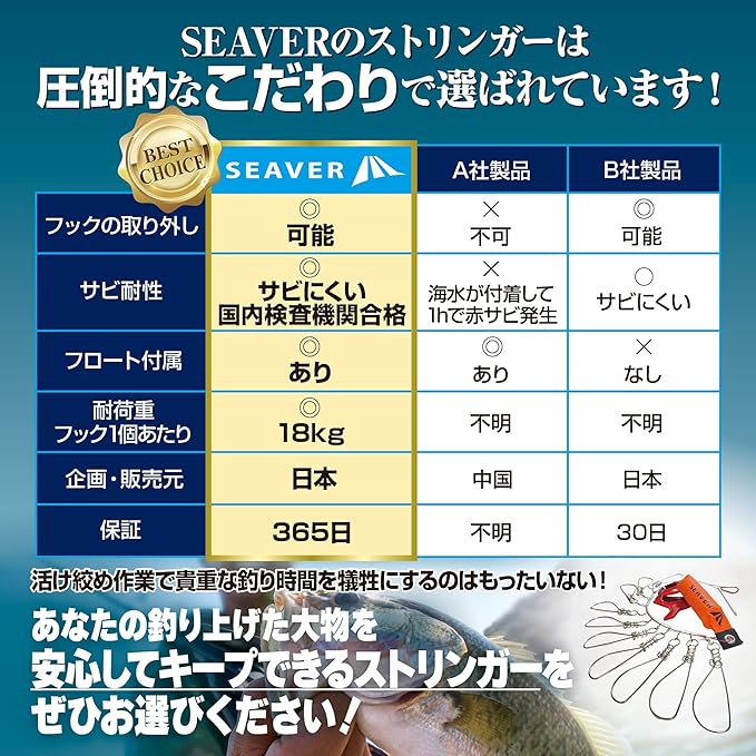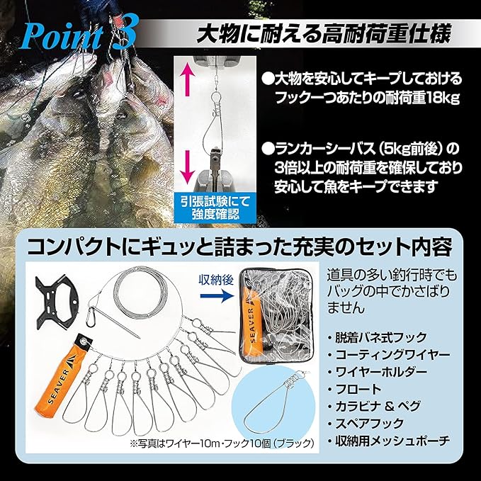 【高耐荷重仕様 】フック一つあたりランカーシーバス約5kgの3倍以上の耐荷重18kgを確保しており、安心して釣り上げた魚をキープいただけます。国内検査機関での引張試験にて耐久性を確認済み。