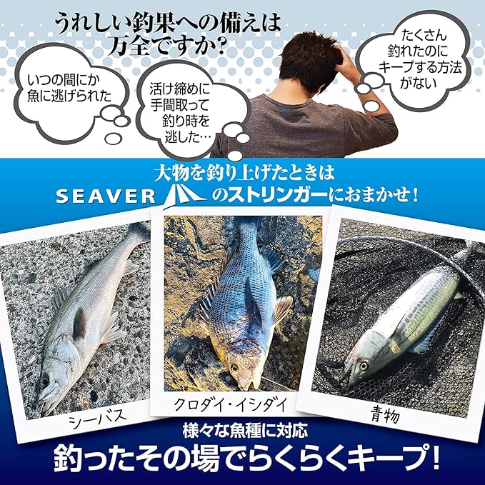 【うれしい釣果への準備に】使い勝手の細部までこだわった視認性抜群のフロート付きストリンガー。あなたの釣り上げた大物を活け締めで時間を無駄にすることなく、手早くキープできます!チヌ、シーバス、ハマチやサゴシなどの青物、カレイ、アイナメなど様々な魚種に対応
