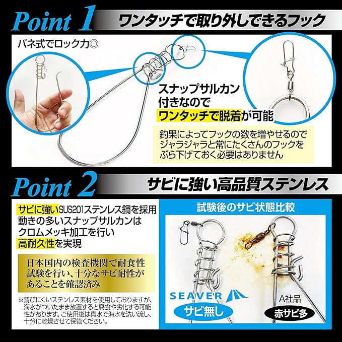 【フックを自由に付け外し】スナップサルカン付きのフックで、ワンタッチで取り付け・取り外しが可能。釣果にあわせてフックの数を増減できるので、常にたくさんのフックをぶら下げておく必要がありません。経年劣化したときもフックだけ交換できるので、長い期間ご愛用いただけます。