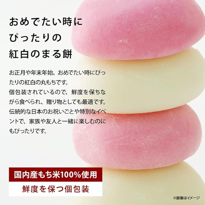 ◆商品説明:国内産水稲もち米100%使用。お正月、年末年始、おめでたい紅白の丸もちです。紅白同量ずつ、おひとつ個包装パックで入っていて便利。