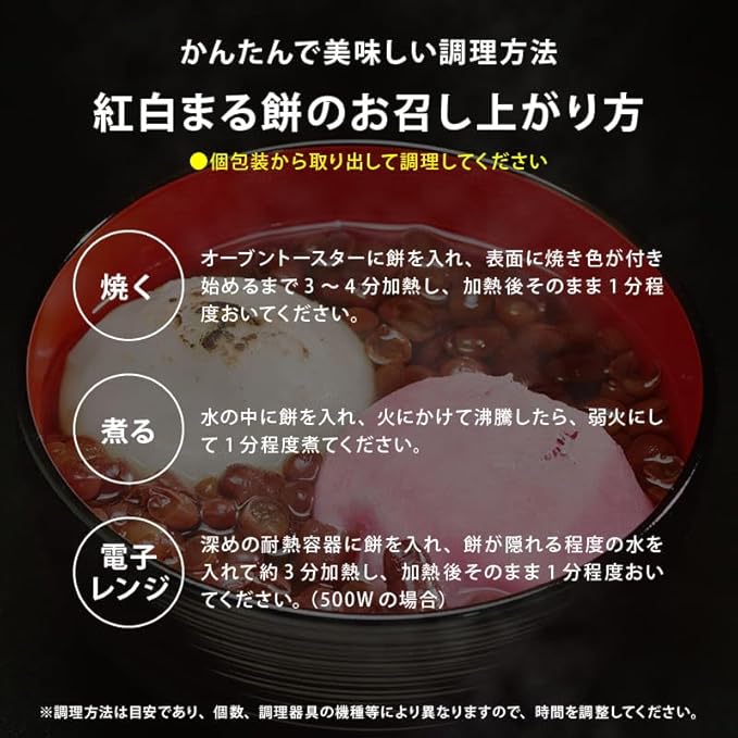 ◆栄養成分(1コ30gあたり):【紅もち】熱量 77kcaL、たんぱく質 1.4g、脂質 0.2g、炭水化物 16.5g、ナトリウム 2.1mg【白もち】熱量 75kcaL、たんぱく質 1.5g、脂質 0.2g、炭水化物 16.0g、ナトリウム 1.5mg