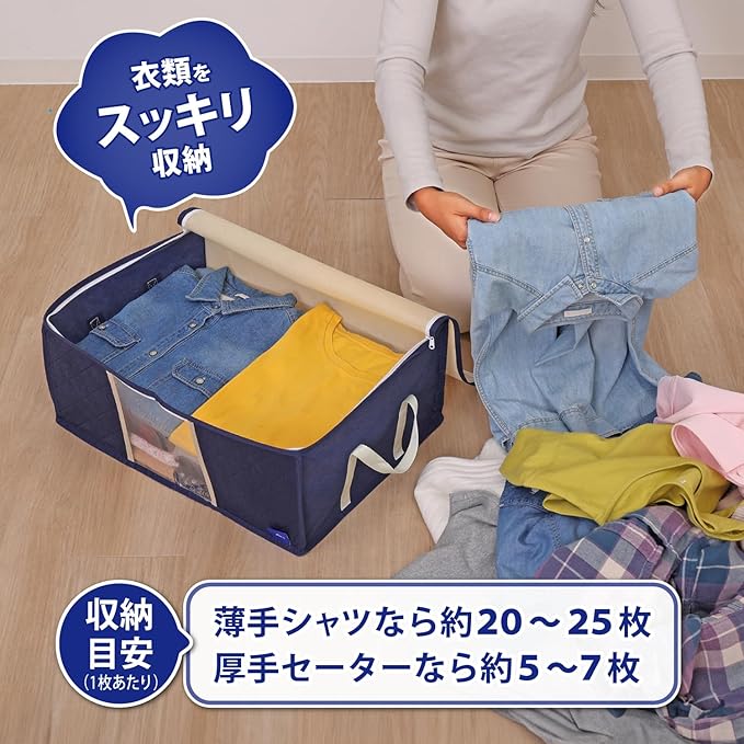 【商品仕様】:サイズ/約幅48 奥行35 高さ20cm、カラー/ネイビー 、内容/3個、収納目安(1ケースあたり)/厚手セーター:約5~7枚・薄手シャツ:約20~25枚、材質/ポリプロピレン・ポリエチレン・活性炭
