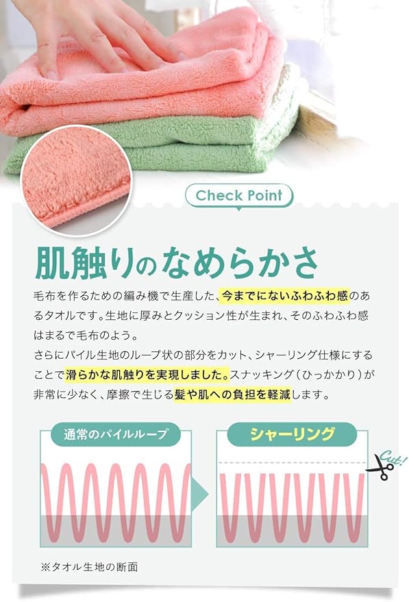 シルクのようななめらかな肌触りの素材とカットパイル仕上げにより、ひっかかりを防ぎ、摩擦で生じる髪や肌へのダメージを軽減します。