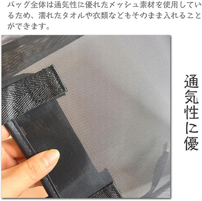 【通気性に優】バッグ全体は通気性に優れたメッシュ素材を使用しているため、濡れたタオルや衣類などもそのまま入れることができます。