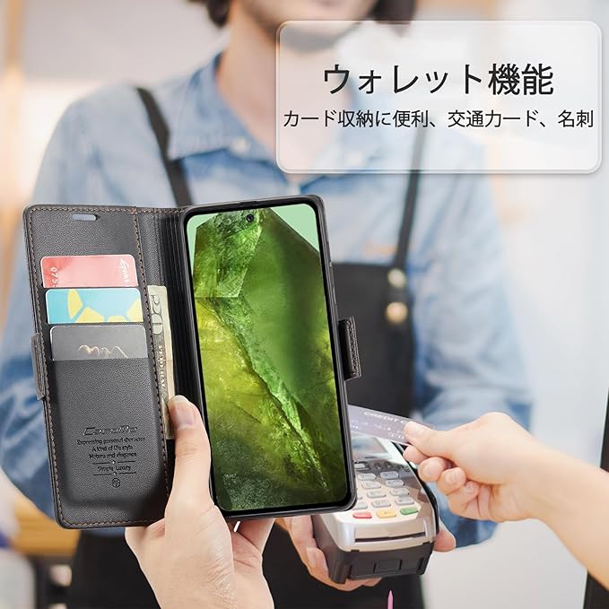 【スタンド機能】横置きのスタンド機能が付いて、ケースを横置くとスタンド機能になり、好きな角度を調節できて、両手が解放され、お気軽に読書やビデオの観賞を楽しむことができます。内側には三つのカード入れとフリーポケットがつき、名刺や定期券の収納に優れています。財布を持ち歩かずに名刺や定期券やをスマホと一緒に持ち歩くことは便利な手帳型ケースです。