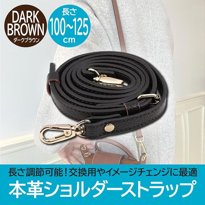 【仕様】サイズ:〈長さ〉100cm~125cm〈幅〉1.2cm〈厚さ〉3mm / 重量:70g / 材質:本革 / カラー:ダークブラウン ※モニターの環境により、色の見え方に若干差が生じる場合がございます。