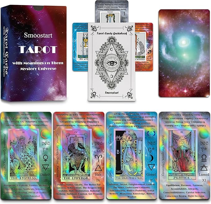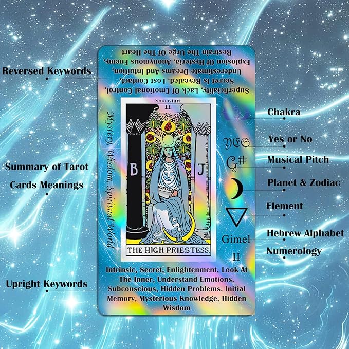 初心者や上級者に最適:このタロットデッキには、直立キーワードと逆キーワードだけでなく、要素、惑星、干支、チャクラ、はいまたはいいえ、音ピッチ、数秘術、ヘブライ語アルファベットなどが含まれています。 学習者はタロットのさまざまな使い方を簡単に習得できます。