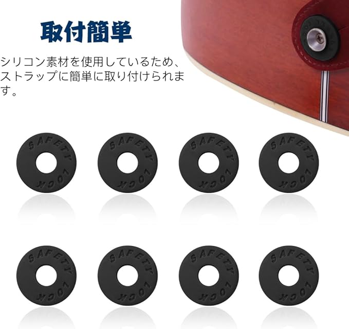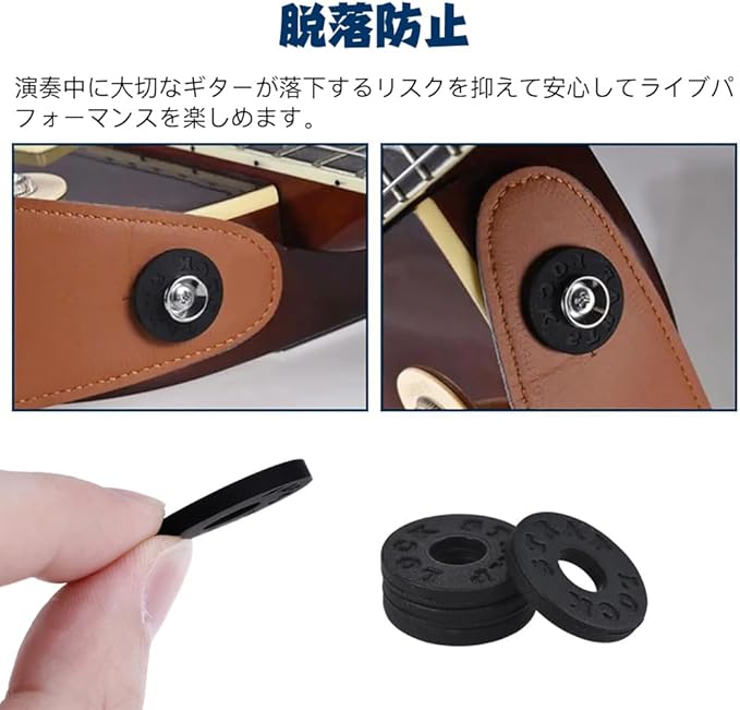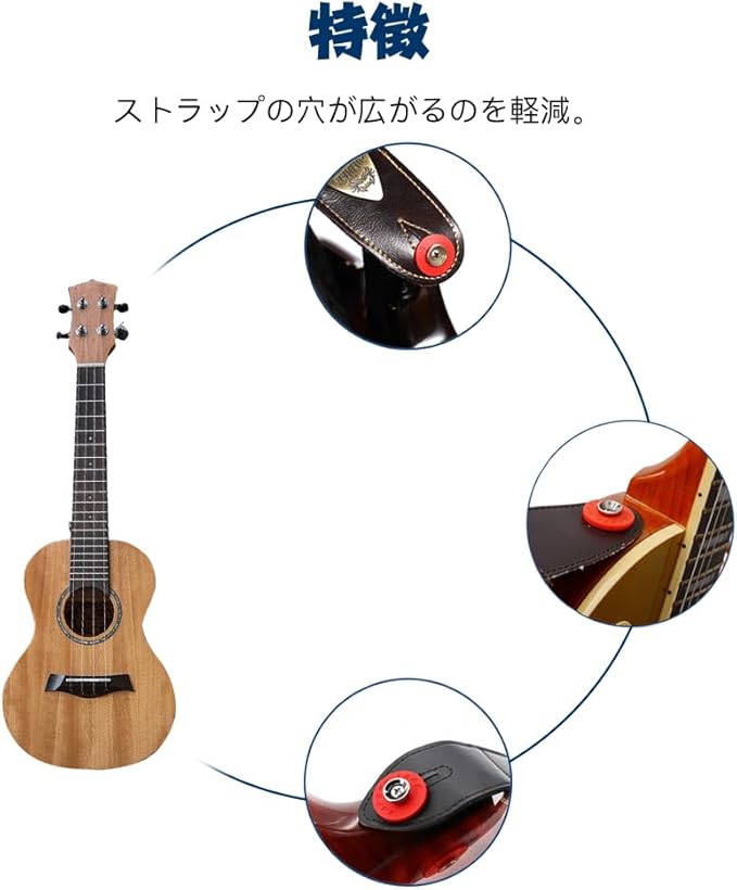 特徴:ギターストラップの穴の広がりを軽減し、ストラップに簡単に取り付けられます。