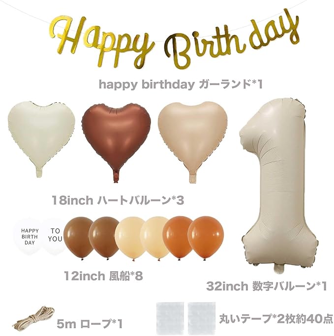 セット内容: happybirthdayガーランド*1 18inch ハートバルーン*3 12inch 風船*8 32inch 数字バルーン*1 5m ロープ*1 丸いテープ*2枚約40点