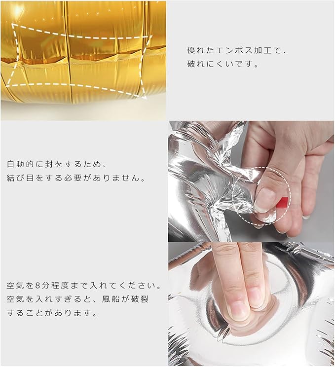 使用方法: 風船の口にストローや空気入れを差し込んで空気を入れてください。 逆止弁が付いているので膨らませたら空気は抜けないようになっております。 注入口は接着されておりストローやハンドポンプが挿し込みにくい場合がございます。 その場合はゆっくり少しづつ押すようにストローを注入口に挿し込んでください。