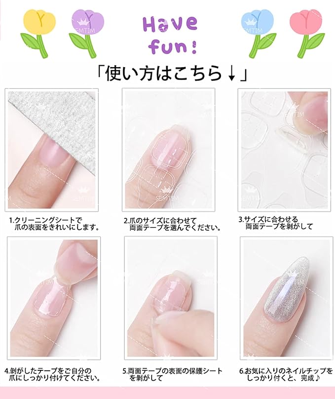 1.内容:ネイルチップ24枚+付替え用両面テープ+取り外し用ウッドスティック1個+爪やすり1個。