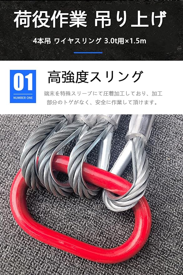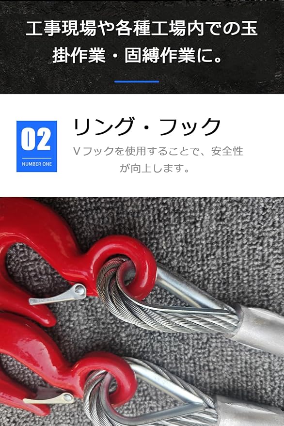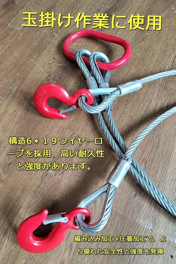 【優れた耐摩耗性】鍛造製リングにワイヤーを使用した2点吊りワイヤーです。ワイヤ ロープ スリングの 6 x 19IWRC 採用、疲労と耐摩耗性のバランスを提供する大きな外側ワイヤを提供します。
