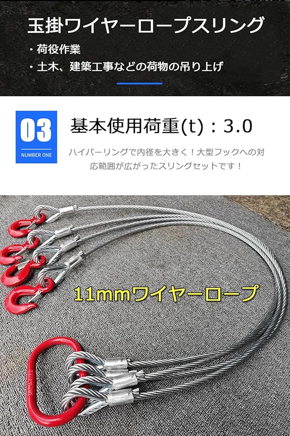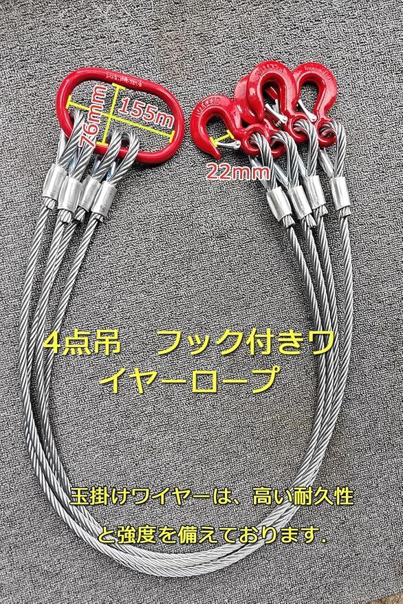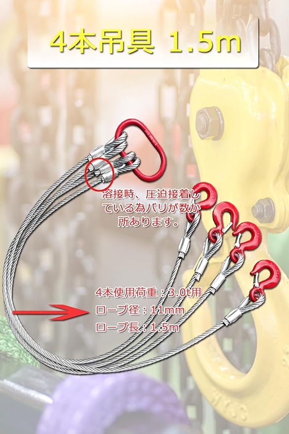 【4点吊りワイヤー】定格荷重…3000kg 本体重量…5.9kgロープ長…1.5m ワイヤー径…11mm フック口開き…22mm
