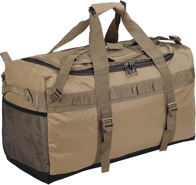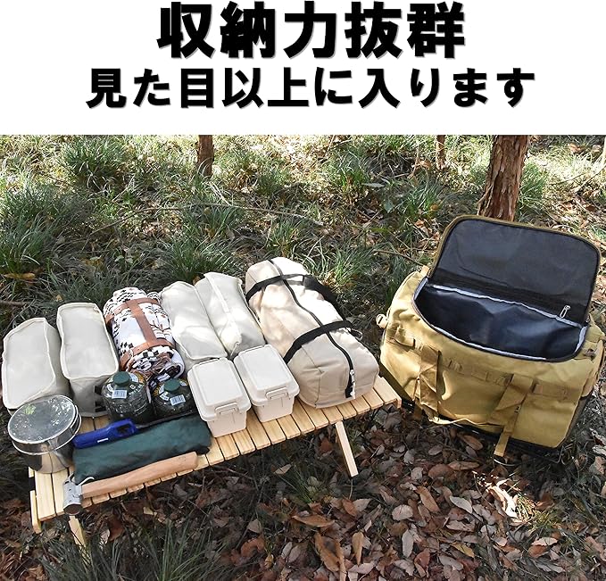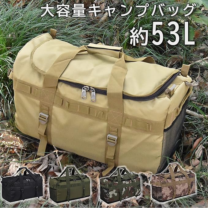 【大容量収納】約53Lの収納力を誇ります。キャンプ道具などアウトドア全般、旅行時の荷物などを収納できる大型アウトドアバッグです。汚れに強く、引き裂き強度の強いナイロン製オックス生地を使用。側面にはクッションが内蔵されており、多少のごついギアをいれたりできます。開口部の裏にはメッシュタイプのファスナー付き収納があるため、小物の収納に最適です。