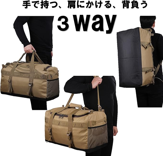 【3WAY仕様】ショルダータイプで肩に担ぐ、バックパックタイプで背負う、ボストンバッグタイプで持つと3タイプで使用できます。ただ、重い荷物をいれた状態ですとバックパックのように使用するには厳しいかもしれません。