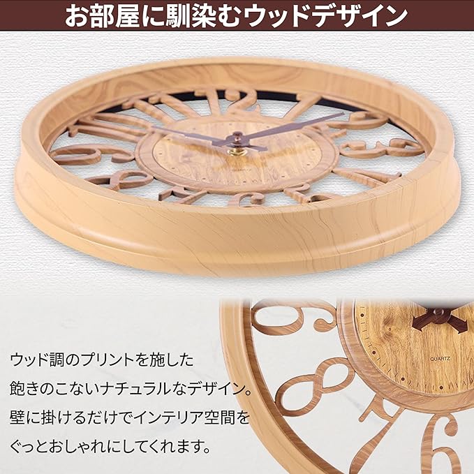 【北欧風のおしゃれな時計】北欧風のおしゃれでシンプルな壁掛け時計。木目調の温もりと落ち着きを感じる飽きのこないデザインで、リビングはもちろん寝室、勉強部屋、オフィス、お店などどんな場所にもなじみます。