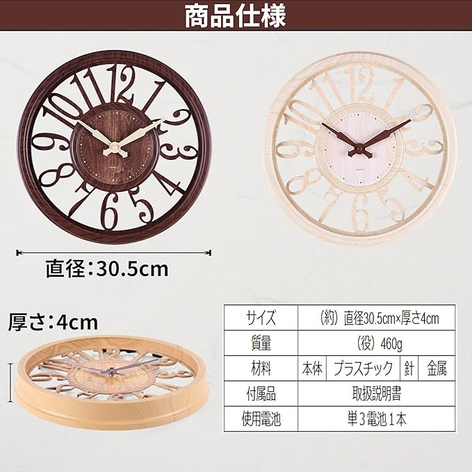 【商品仕様】サイズ:(約)直径30.5cm 厚さ4cm・重量:(約)460g・材質:本体:プラスチック 針:金属・付属品:取扱説明書・使用電池:単3電池1本(別売)