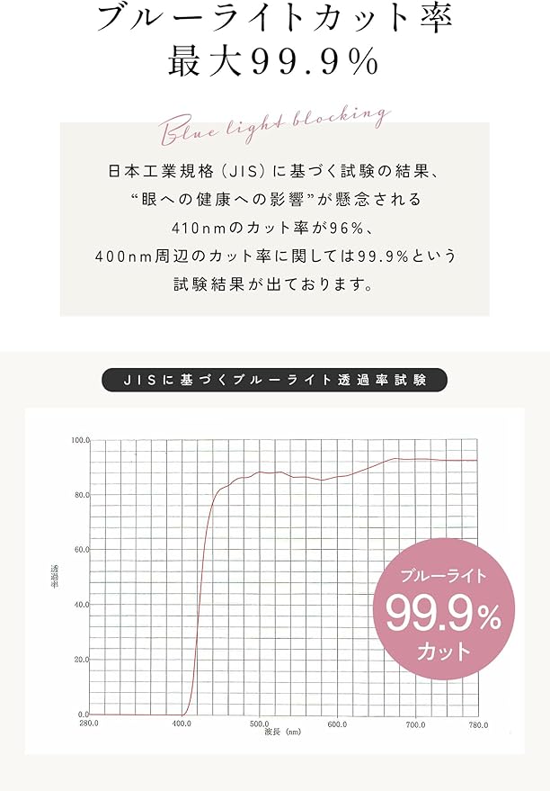 【ブルーライトカット率最大99.9%】 日本工業規格(JIS)に基づく試験の結果、 ”眼への健康への影響”が懸念される400nmのカット率が99.9%、410nmのカット率が96%という試験結果が出ております。 UVカット率は99.9%カット 紫外線カットの効果も期待できるので、紫外線対策としてもお使いいただけます。