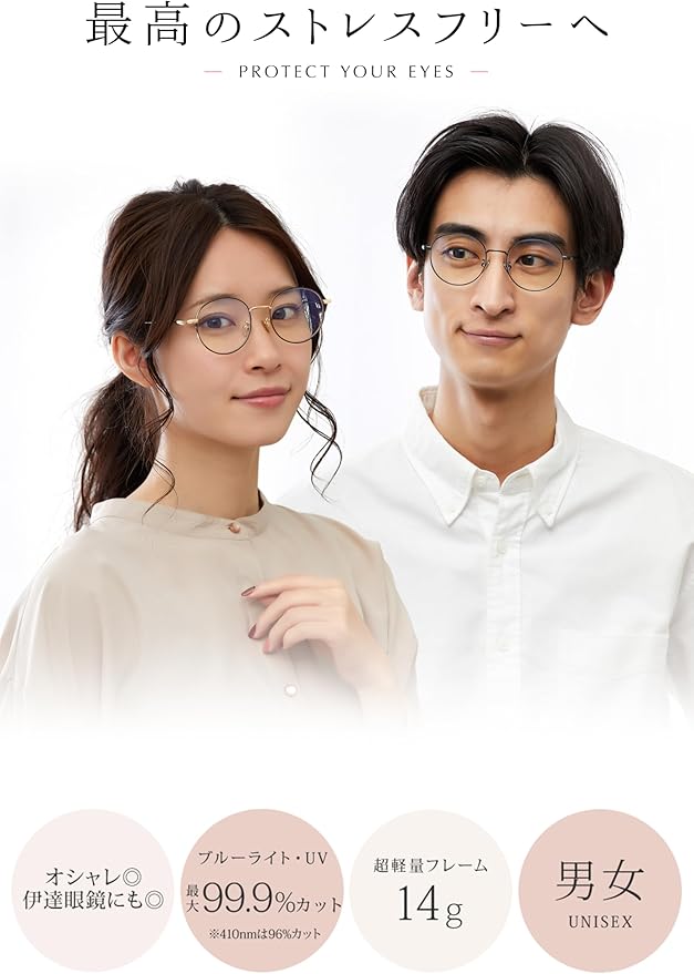 【最高のストレスフリーへ】 PROTECT YOUR EYES ・オシャレ◎伊達眼鏡にも◎ ・ブルーライト、UV最大99.9%カット ・14gの超軽量フレーム ・男女 UNISEX 【様々な用途でお使いいただけます】・スマホ操作時やテレビ鑑賞時のブルーライトカット対策として ・PCでの作業や操作などによる疲れ目対策として・オンライン授業に ・テレワークに ・スマホゲームやPCゲームの際に ・タブレット操作時や動画視聴時の目の負担軽減に ・日差しなどによる紫外線対策に ・飛沫防止策として ・プレゼントに
