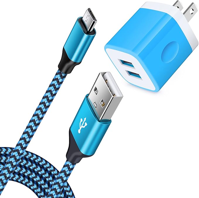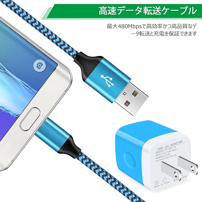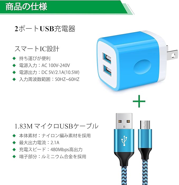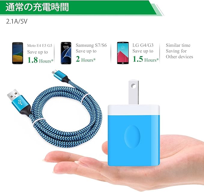 USB充電器 2ポート USB電源アダプター + Micro USB ケーブル*1.8M Hootek 5V/2.1A ACアダプター USB コンセント 2口 マイクロUSBケーブル 高耐久 ナイロン編み スマホ充電コード Galaxy S7 S6 Edge A6 J8 J5、LG V10 G4 G3 K30 K20 PlなどタイプB 機器に対応(ブルー) | oioioichan