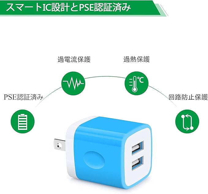 ♬ 2ポートUSB充電器:USB-Aポートを2個搭載しています。合計2.1A高出力ですが、最速のスピードで同時に二つの設備に充電することが可能、しっかり安全設計で、過電圧、過放電、過熱保護機能搭載でショートやアダプタの発火などを防止します。電池が満ちている後、充電が自動的に停止します。