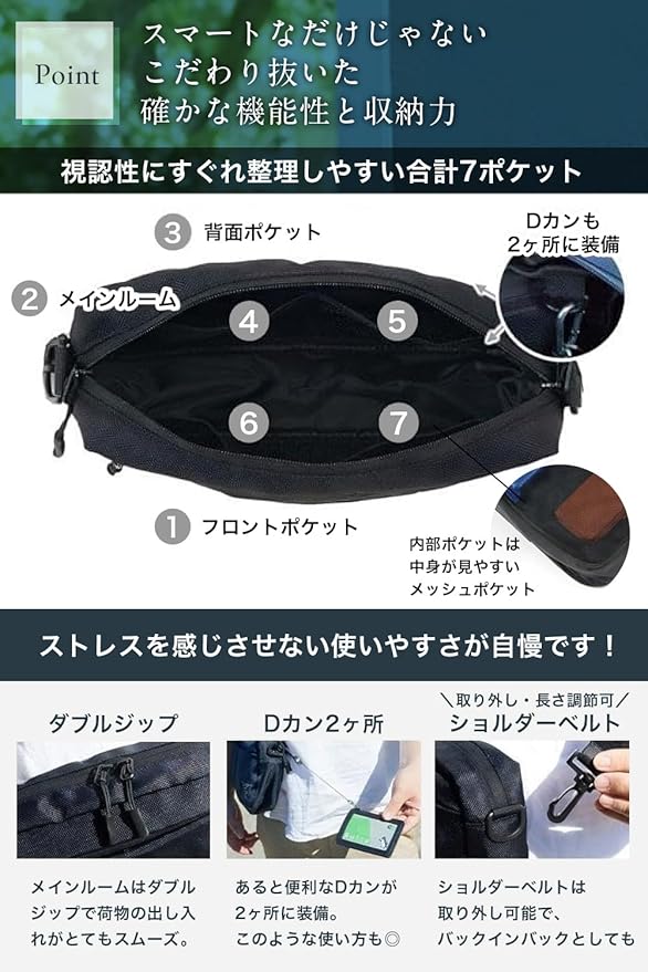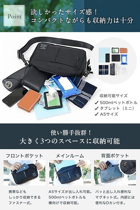 【軽量コンパクトながら充実した収納の秘密】 本体重量は約150gと超軽量で疲れにくい。 ミニショルダーバッグには希少なフロントポケット、メインポケット、背面ポケットの大きく3つの収納があり。 メインポケットにはSwitchやA5サイズまで収納可能。背面ポケットはマグネット式で、パッと出し入れする物の収納に適しています。 またメインルーム内と背面ポケット内にはDカンも装備 鍵のポジションも決めれて使い勝手が更にアップ!