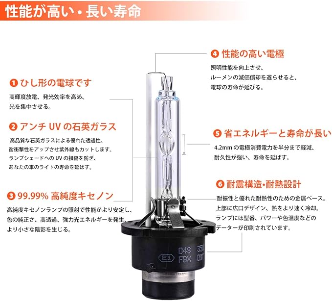 【高品質・高性能を兼ね備えたHID】コストパフォーマンスがいい! 瞬間的に起動する時は、明るさと安定性に優れている。明るさはハロゲン電球より3倍明るいです、消費電力を半分まで軽減、ハロゲンより5倍以上アップした寿命!効率的な省エネ・環境保護を実現します!