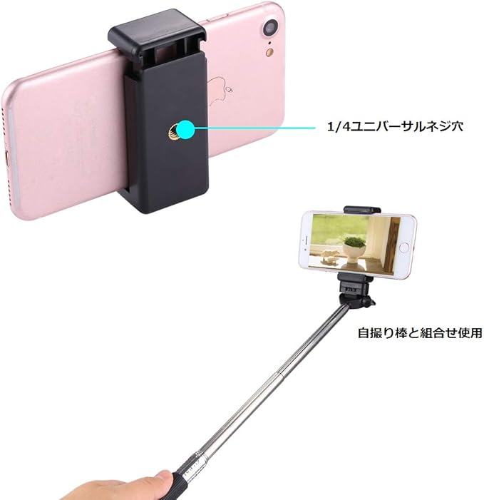クランプのベースと背面にはそれぞれが1/4インチのネジ穴があり、携帯電話のアクセサリー、セルフスティック、三脚マウント、一脚など1/4インチのネジと互換性があるデバイスに接続できます。