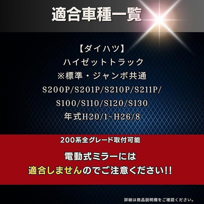 適合車種一覧 【DAIHATSU】ハイゼットトラック(S200P/S210P/S100/S110/S120/S130) ※標準・ジャンボ共通 ・ダイハツ ハイゼット トラック S200P / S201P / S210P / S211P DAIHATSU HIJET TRUCK S200P / S210P / S100 / S110 / S120 / S130 ・年式H20/1~H26/8